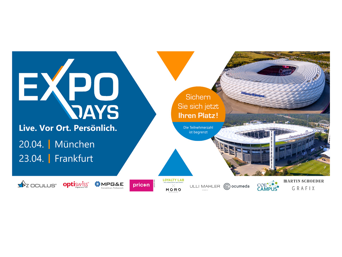 Nach dem großen Erfolg der vergangenen Jahre setzt Oculus seine Expo Days auch 2026 fort und bringt Innovation, Networking und Praxiswissen zu den Augenoptikern vor Ort – in den VIP-Bereichen der Allianz Arena des FC Bayern München am 20. April 2026 sowie dem Deutsche Bank Park von Eintracht Frankfurt am 23. April 2026. Die Teilnahme ist kostenfrei.